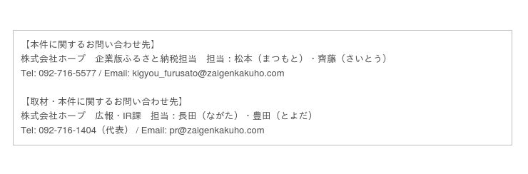 自治体に特化したサービスを展開する株式会社ホープ(本社:福岡県福岡市、代表取締役社長兼CEO:時津孝康、証券コード:6195、以下「当社」)は、企業向けに企業版ふるさと納税制度の周知と、業務委託を受けた自治体への納税案内を行う新サービス、「企業版ふるさと納税支援サービス」を開始いたしましたので、お知らせいたします。現時点で佐賀県小城市および福岡県筑後市と本サービスに関する業務委託契約を締結し、2自治体に対するふるさと納税のご案内を、全国の企業へ開始しております。