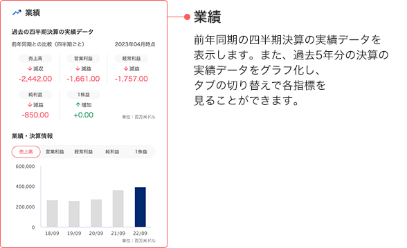 今回の機能強化では、米国株の情報を対象とし、初心者の方にも銘柄選定をスムーズに行えるように、スマホ画面上でも見やすいシンプルなビジュアルでお届けします。