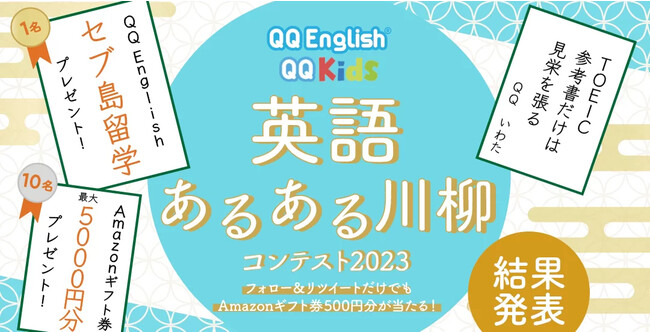 株式会社QQEnglish (本社:東京都渋谷区、代表取締役:藤岡 頼光)は、提供するオンライン英会話サービス「QQEnglish」「QQキッズ」にて、2023年2月1日より開始した英語あるある川柳コンテストの受賞作品の発表を行いましたことをお知らせいたします。