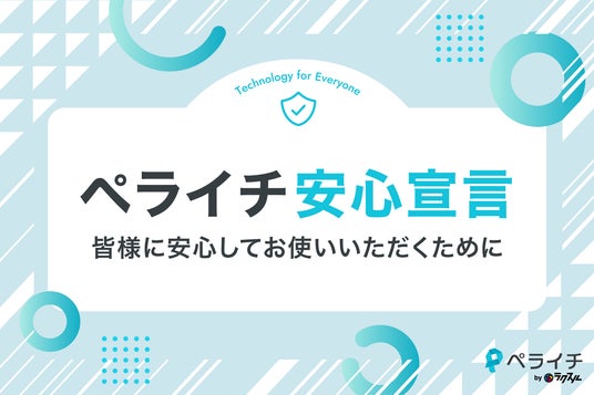 ペライチは、Visionに「Technology for Everyone / テクノロジーをすべての人が使える世界に」、Missionに「Make change Easily」を掲げています。私たちは、ITリテラシーの高低にかかわらず、すべての人がテクノロジーを活用し、想いを実現できる世界を目指しています。だからこそ、ペライチのサービスは安心して続けられるものでなければならないと考えています。今回の「ペライチ安心宣言」は、Vision実現に向けて、お客様に対する具体的な行動原則として言葉にするものです。