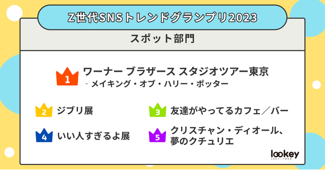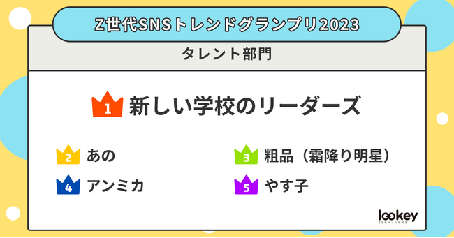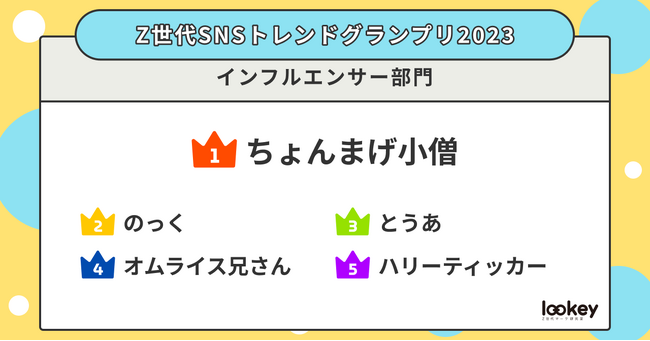 『Z世代SNSトレンドグランプリ2023』は、19歳~23歳のZ世代400名を対象に、今年のSNSトレンドについて「インフルエンサー部門」「タレント部門」「コンテンツ部門」「スポット部門」「グルメ部門」の5部門に分けてアンケート調査を実施。その結果をランキング化しました。