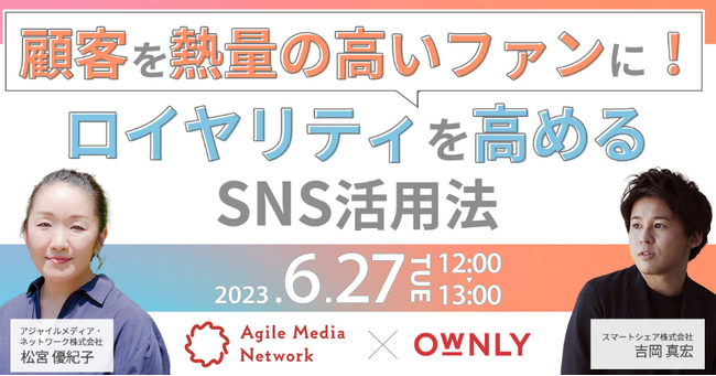 SNSマーケティングプラットフォーム「OWNLY」(オウンリー)を開発・運営するスマートシェア株式会社(東京都渋谷区、代表取締役 西山統)は、アジャイルメディア・ネットワーク株式会社(東京都港区、代表取締役社長 CEO 宮地 広志、東証グロース上場:証券コード6573)と2023年6月27日(火)にオンラインセミナーを開催いたします。