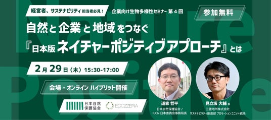 ● 第4回は「自然と企業と地域をつなぐ『日本版ネイチャーポジティブアプローチ』とは」と題し2/29(木)に開催。地域に即したネイチャーポジティブへの貢献度や達成状況等を定量的に評価する取り組みを解説