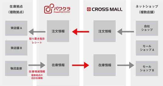 このたびの連携で、実店舗・倉庫の在庫増減が「CROSS MALL」に自動反映されるため、複数ネットショップを運営する企業さまにおいても、最新の在庫情報によるショップ運営が可能です。また、ネットショップ専用の在庫を抱える必要がなくなり、今ある在庫を全て表示する運用が可能になります。売り越し防止や業務効率化だけでなく、機会損失を防ぐことで販売促進も実現します。