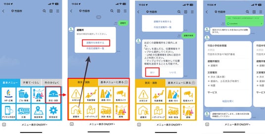 「避難所検索機能」は、チャットボットの案内に従って自身の位置情報をLINEに送信することで、近くの避難所施設を案内する機能です。普段から近くの避難所を確認しておくことができ、万が一災害が発生した際は検索した避難所の開設状況を知ることが可能です。