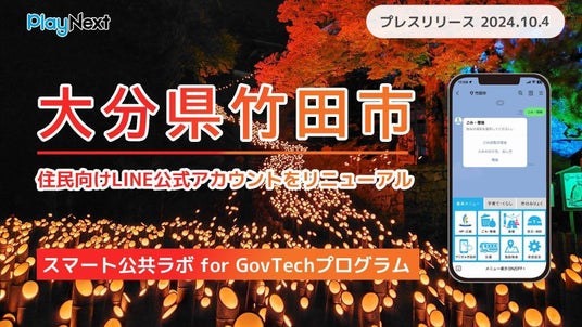 プレイネクストラボ株式会社(本社:東京都品川区、代表取締役:柏 匠、以下 「プレイネクストラボ」)の提供する「スマート公共ラボ for GovTechプログラム」が、大分県竹田市(以下「竹田市」)のLINE公式アカウントに採用され、2024年10月4日(金)より一般公開したことをお知らせします。