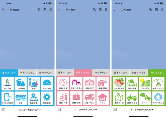 画面下部に表示されるメニューをタブ機能を使うことにより様々なジャンルの情報を提供することが可能となりました。「基本メニュー」「子育て・くらし」「市のみりょく」の3つのリッチメニューより、各種チャットボットを起動することができます。