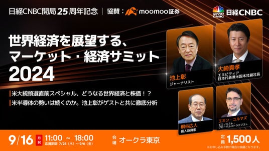 株式会社日経CNBC(本社:東京都千代田区、代表取締役社長:竹之内源市、以下「日経CNBC」)は2024年10月に開局25周年を迎えます。それを記念し、2024年9月16日(祝・月)に開催する「日経CNBC開局25周年記念イベント『世界経済を展望する、マーケット・経済サミット2024』」の、ミニセミナー出演者を発表します。