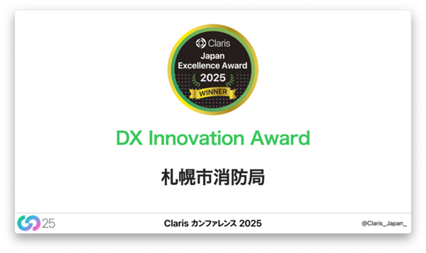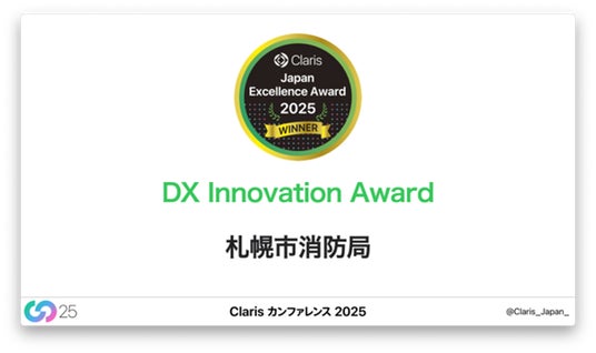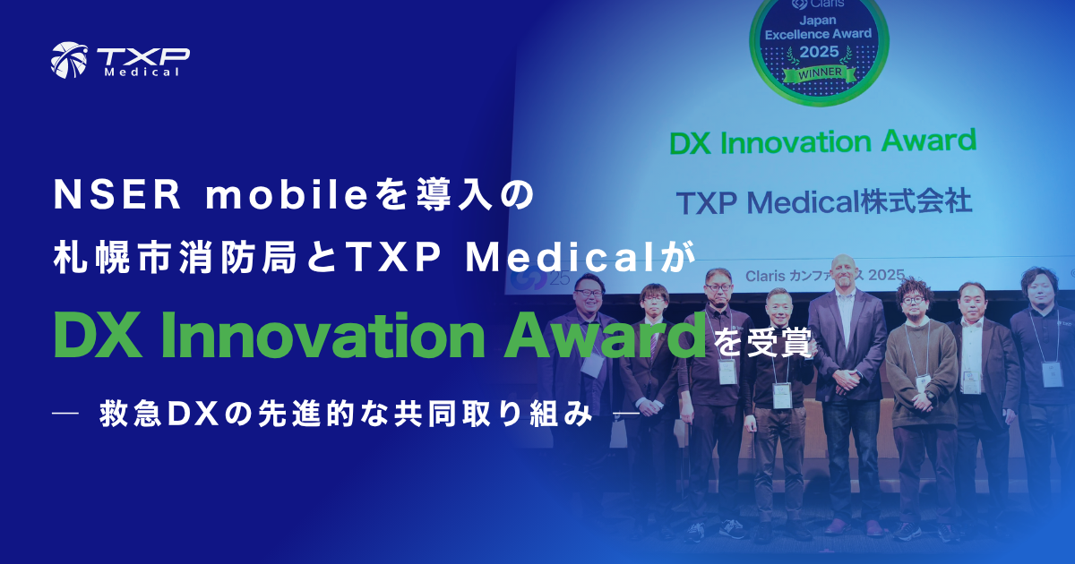 TXP Medical株式会社(本社:東京都千代田区、代表取締役CEO:園生 智弘、以下「TXP Medical」)の救急隊アプリ「NSER mobile」を利用し、2024年2月より運用を開始した札幌市消防局の「救急医療『見える化』システム」、およびTXP Medicalが、「Claris Japan Excellence Award 2025」において、それぞれ「DX Innovation Award」を受賞しました。