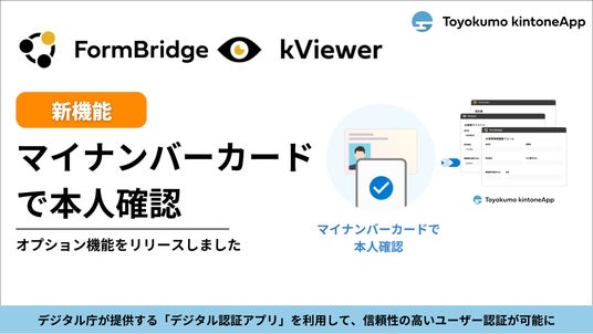 トヨクモ株式会社(本社:東京都品川区、代表取締役社長:山本 裕次、以下トヨクモ)がサイボウズ株式会社(本社:東京都中央区、社長:青野 慶久、以下サイボウズ)が提供する業務改善プラットフォームである「kintone」と連携するFormBridgeとkViewerにおいて、「マイナンバーカードで本人確認」のオプションを提供開始したことをお知らせいたします。