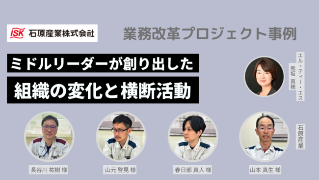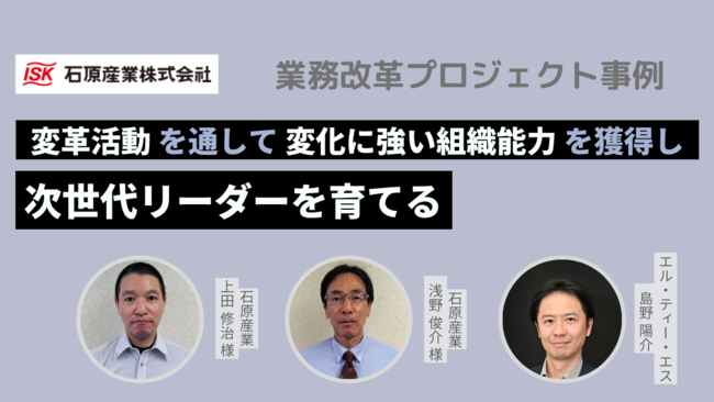 株式会社エル・ティー・エス(本社:東京都新宿区、以下、LTS)は、コンサルティング支援を通じたお客様の業務改革プロジェクト事例の公開企画を開始しました。第一弾として、石原産業株式会社(本社:大阪府大阪市)における、全社業務改革プロジェクトを通じた「変化に強い組織能力獲得・次世代リーダー育成」についての事例を公開しました。