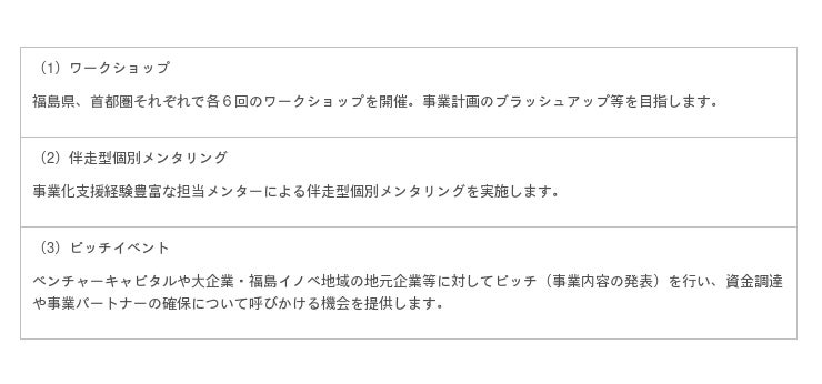 福島イノベ地域において、重点6分野で起業や事業化を目指す企業や個人を対象に、経験豊富な専門事業者がビジネスアイデアのブラッシュアップなどを行い、事業化に導くプログラムです。