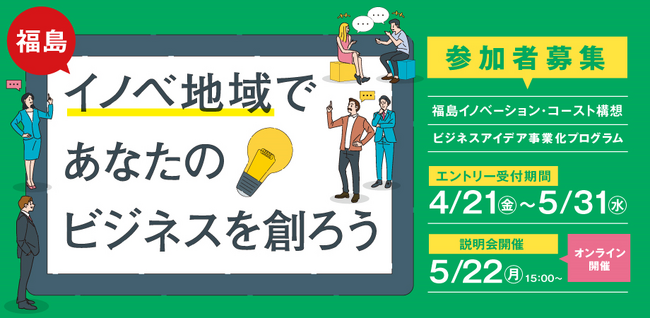 福島県浜通り地域等15市町村(以下、福島イノベ地域)で技術シーズの事業化を目指す「ビジネスアイデア事業化プログラム」(委託元:公益財団法人福島イノベーション・コースト構想推進機構 以下、福島イノベ機構)を受託した株式会社クリーク・アンド・リバー社(運営主体)及び株式会社ツクリエ(共同運営)は、本プログラムの参加者を5月31日(水)まで募集しており、5月22日(月)にはオンライン説明会を開催いたします。
