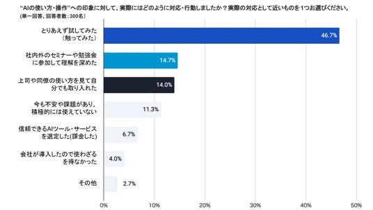 - “使い方・操作”の面で不安やハードルを感じながらも、半数近くの46.7%の人が「とりあえず試してみた」ことでAI活用への第一歩を踏み出した。