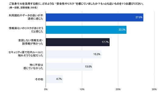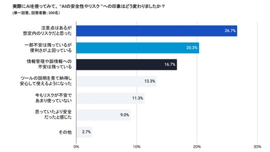 実際に使用した後の印象としては「注意点はあるが想定内のリスクだった」(26.7%)、「一部不安は残るものの便利さが上回っている」(20.3%)という回答が多く、導入後は実用性を実感している様子がうかがえた。