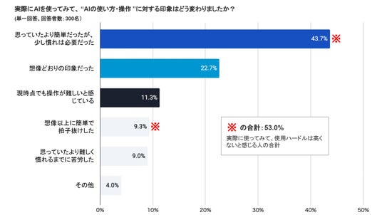 こうした不安に対して、46.7%の人が「とりあえず試してみた」と自ら行動を起こしており、実際に使用してみた結果「想像以上に簡単で拍子抜けした」「思っていたより簡単だった」と回答した人は合わせて53.0%に達した。