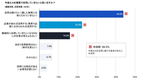 ● 今後の活用意向については「積極的に活用したい(もうAIなしは考えられない)」が16.0%、「活用は続けたい(適した業務には取り入れていきたい)」が44.0%となり、全体の60.0%が今後も前向きに活用していきたいと考えていることがわかった。