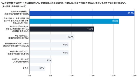 これに対する対応としては「社内ルールを確認した」(25.0%)、「自分で使用ルールを決めた」(21.3%)など、慎重かつ前向きな行動が見られた。