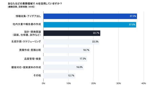 - 実際にAIを活用している業務領域では、「情報収集・アイデア出し」(37.3%)「社内文書や報告書の作成」(37.0%)「設計・開発関連」(22.7%)「見積作成・見積比較」(18.7%)と、オフィス業務から設計現場まで多岐にわたる活用が進んでいる。