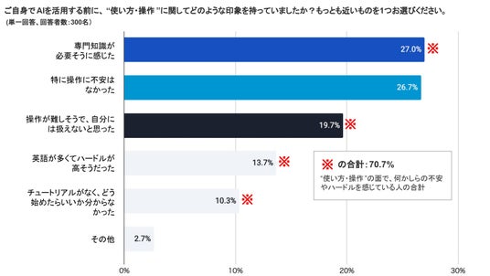 ● AIツール使用開始前に“操作・使い方”に対して不安を抱いていた人は全体の70.7%。