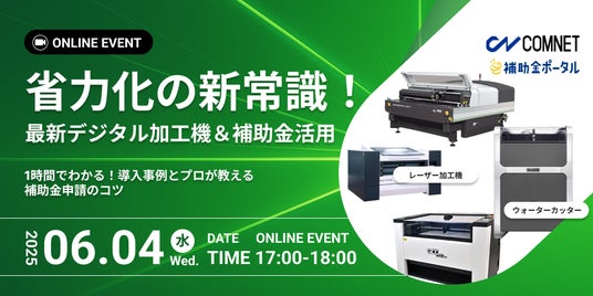 人手不足やコスト高騰に悩む製造業の皆さまへ―― 最新のデジタル加工機導入を補助金活用で導入する事で、現場の生産性アップと省力化を一気に実現できるチャンスです! 本セミナーでは、最先端のデジタル加工機の事例や、今すぐ使える補助金の活用術を専門家がわかりやすく解説。「設備投資の負担を減らしたい」「現場をもっと効率化したい」そんな経営者・担当者の方、ぜひご参加ください。 株式会社補助金ポータル(本社:東京都渋谷区、代表取締役:福井彰次)は、コムネット株式会社(本社:兵庫県神戸市、代表取締役:五十嵐 晃治)と共催で、「省力化の新常識!最新デジタル加工機&補助金活用術 1時間でわかる!導入事例とプロが教える補助金申請のコツ」をテーマにした無料オンラインセミナーを2025年6月4日(水)17時~18時に開催いたします。Zoomでどなたでもお気軽にご視聴いただけますので、ぜひご参加ください。