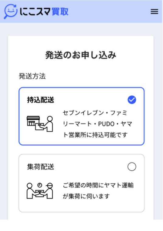 「にこスマ買取」でセブン-イレブンの持込配送を利用する場合、申込み画面で「持込配送」を選び、「セブンイレブン」を選択します。梱包したスマートフォンやタブレットを店舗に持ち込み、画面に表示されたバーコードを店頭で読み取ることで発送が完了します。