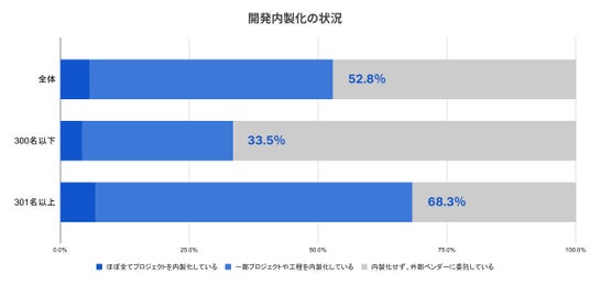 出典:独立行政法人情報処理推進機構『2024年度ソフトウェア動向調査』Q2-27「開発内製化の状況」より、当社にてグラフ化(Q1-3「企業種別」は「ユーザー企業」「ユーザー系情報システム子会社」、Q1-7「従業員数」は「わからない」を除外。Q2-27の選択肢で「開発を実施する必要がない」「わからない」と回答した企業も除外)