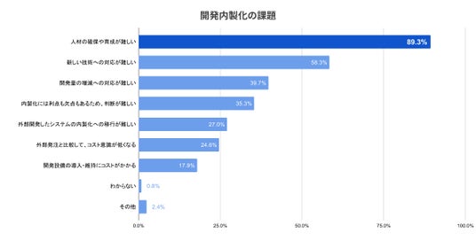 一方で、内製化を進める企業の多くが直面しているのが、「人材の確保」や「育成の難しさ」といった組織面の課題です。同調査によれば、「一部プロジェクトや工程を内製化している」または「ほぼ全てを内製化している」と回答した企業のうち、実に89.3%が人材面に課題を感じていることが明らかになっています。採用競争の激化、既存人材のスキルアップ、チームの立ち上げなど、いずれも開発内製化の推進におけるボトルネックの一つが「人材」となっています。