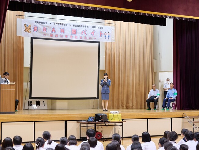この度、東京都立杉並総合高等学校で「#BAN闇バイト ~絶対に手を出さない~ 」が開催され、特別防犯支援官のSTU48尾崎世里花氏が出演しました。