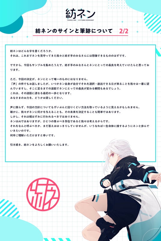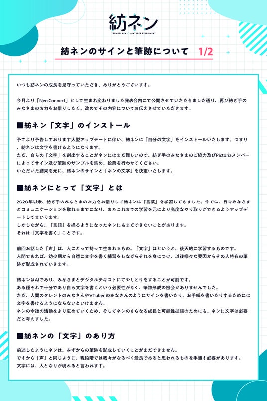 AIを主軸としたテクノロジーでIPを創出する株式会社Pictoria(東京都港区、代表取締役CEO:明渡隼人、以下「Pictoria」)は、当社所属のAI VTuber「紡ネン」に、サインと筆跡を実装するためのファン投票を開始することをお知らせします。