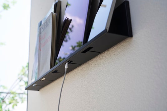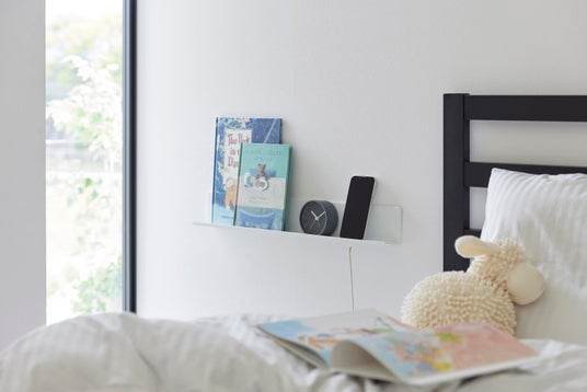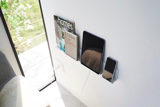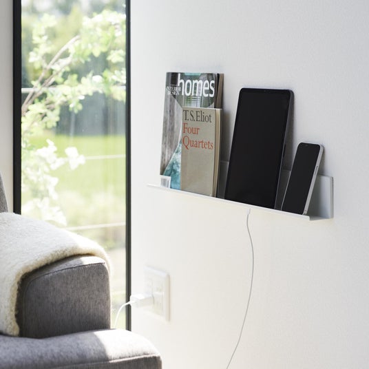 ブレットPCや本を石こうボードピンで壁に浮かせて収納できるスリムな棚。