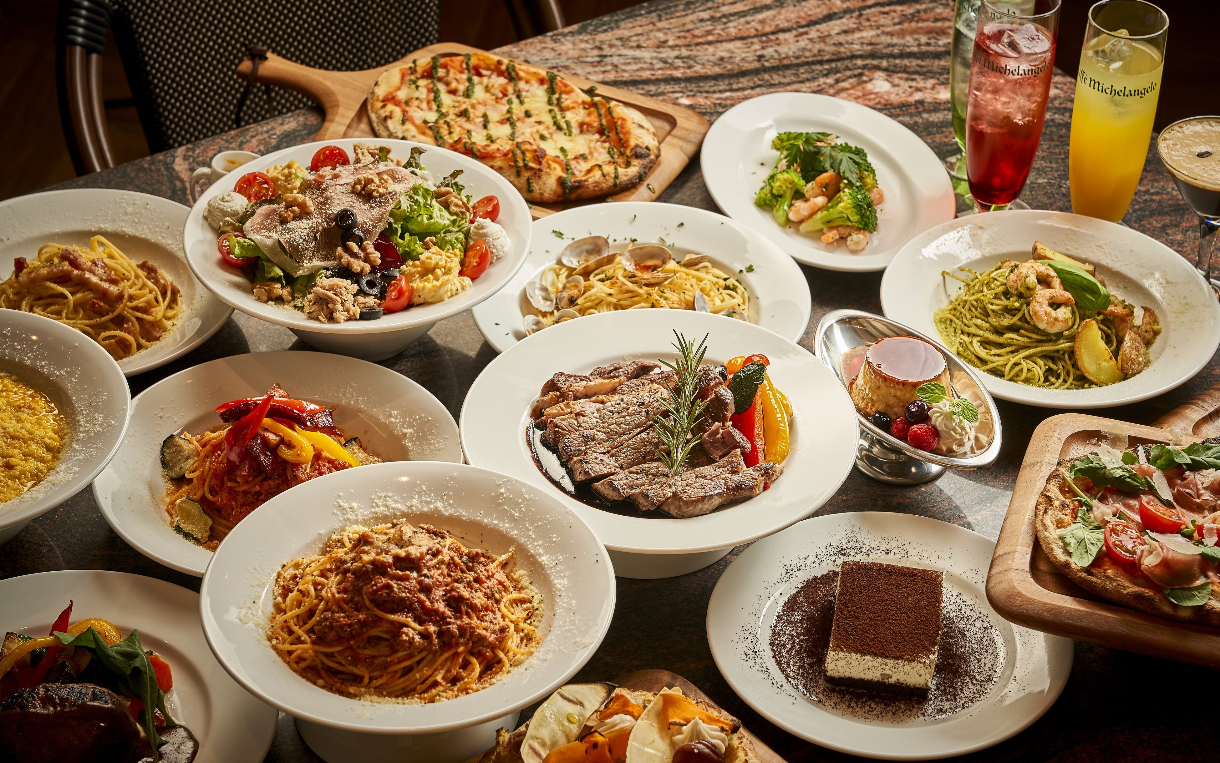 人気メニュー「ミケランジェロプリン」、またピッツァのヘルシー進化系、「ピンサ」もおすすめです。都会の喧騒から離れて、ゆったりとしたひと時をお過ごしいただけます。