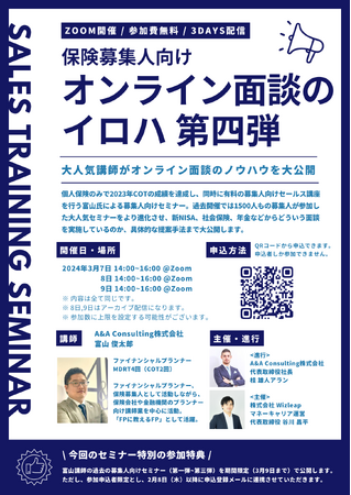 個人保険のみで2023年COTの成績を達成し、同時に有料の募集人向けセールス講座を行う富山氏による募集人向けセミナー。過去開催では1,500人もの募集人が参加した大人気セミナーをより進化させ、新NISA、社会保険、年金などからどういう面談を実施しているのか、具体的な提案手法まで大公開します。