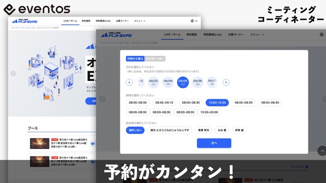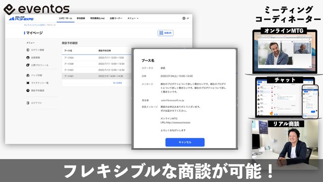 イベントプラットフォームeventosは、「オンラインイベント」「対面イベント」問わず出展者と来場者、配信者と視聴者といったイベントでビジネスを行う両者のマッチングを実現すべく、新機能「ミーティングコーディネーター」を実現いたしました。