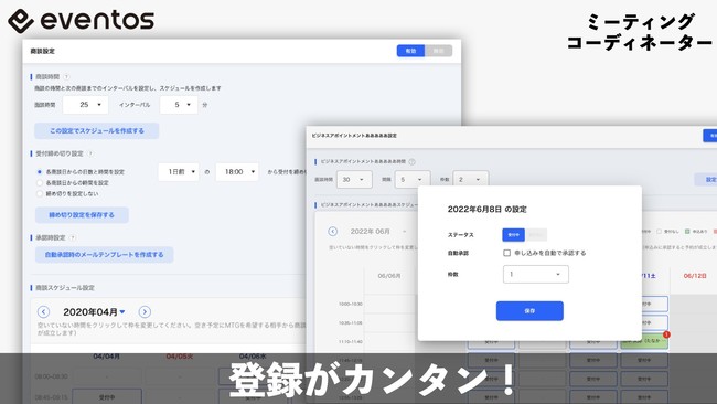 商談予約の登録作業などは一見難しく思われる方も多いと思いますが、eventosの商談予約機能は直感的に作成・登録できるUIとなっておりますので、説明書いらずで簡単に設定が可能となります。