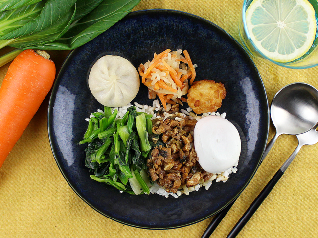 五香粉(ウーシャンフェン)が香るルーローハンです。細かく刻んだチャーシューと高菜漬けを五香粉と混ぜ合わせて本格的な味わいに仕上げております。添え野菜のチンゲン菜、とろりとした半熟風たまご、鶏ガラスープで炊き上げたレジラ米と一緒によく混ぜてお召し上がりください。副菜は小籠包、紅白野菜の胡麻あえ、さといもフライです。