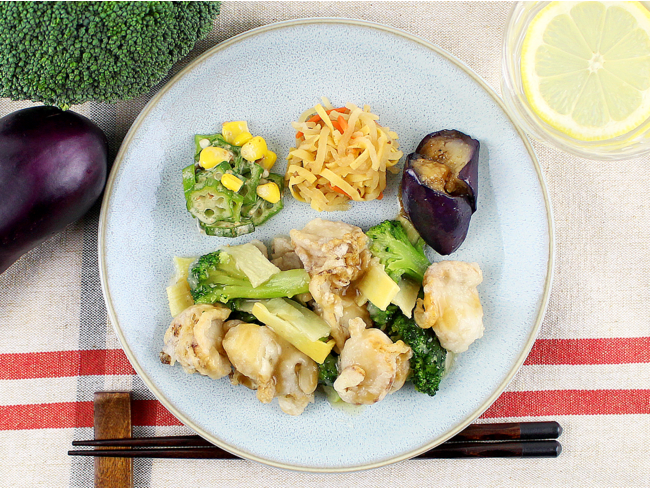 副菜は、オクラとコーンを胡麻ソースであえたもの、大根と人参、錦糸卵を香味醤油であえた紅白野菜と卵の香味だれ、さっぱりとした揚げ茄子の甘酢です。