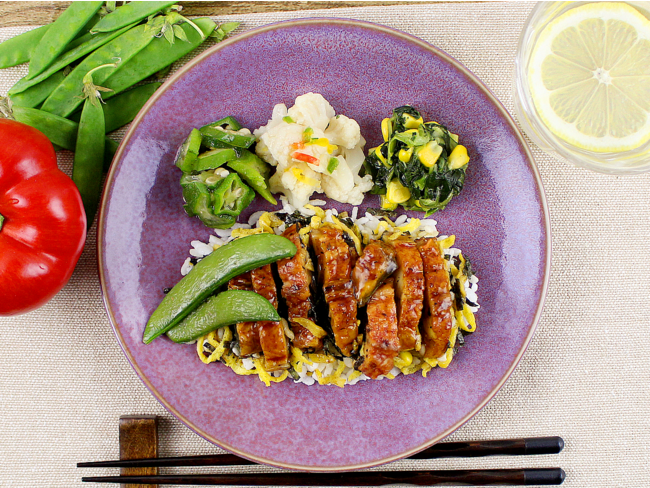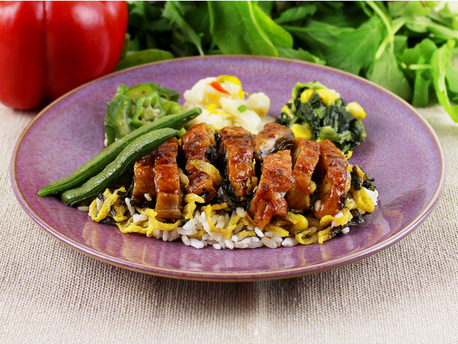 7月23日の土用丑の日にぜひ召し上がっていただきたい、うなぎを使用したプレートをご用意しました。細かく刻んだうなぎの蒲焼に甘みのある山椒入り醤油だれをかけて仕上げております。添え野菜にスナップエンドウ、風味豊かな錦糸たまごに香りのよい焼きのりを合わせました。こんにゃく米をブレンドしたごはんと一緒にお召し上がりください。