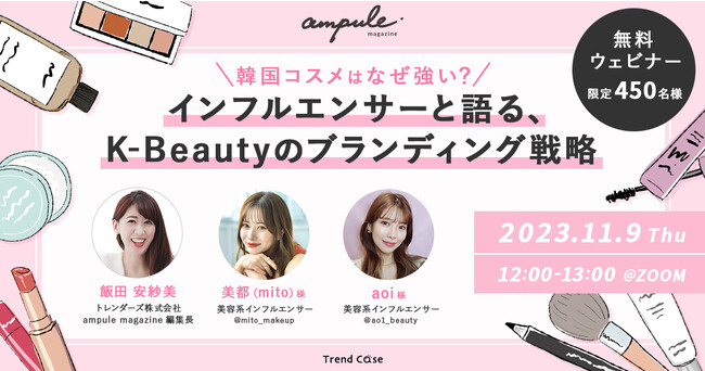 トレンダーズ株式会社(所在地:東京都渋谷区、代表取締役社長:黒川涼子、東証グロース上場:証券コード 6069)が運営する美容特化型イノベーションファーム「ampule(アンプル)」は、「韓国ビューティーの『リアル』を解き明かす」をテーマに、美容業界の課題や変革と向き合い、情報を発信することで美容業界の「知る」を変えるフリーマガジン「ampule magazine Vol. 08」を発行いたしました。また、これを記念して無料ウェビナー<韓国コスメはなぜ強い? インフルエンサーと語る、K-Beautyのブランディング戦略>を、2023年11月9日(木)に開催いたします。