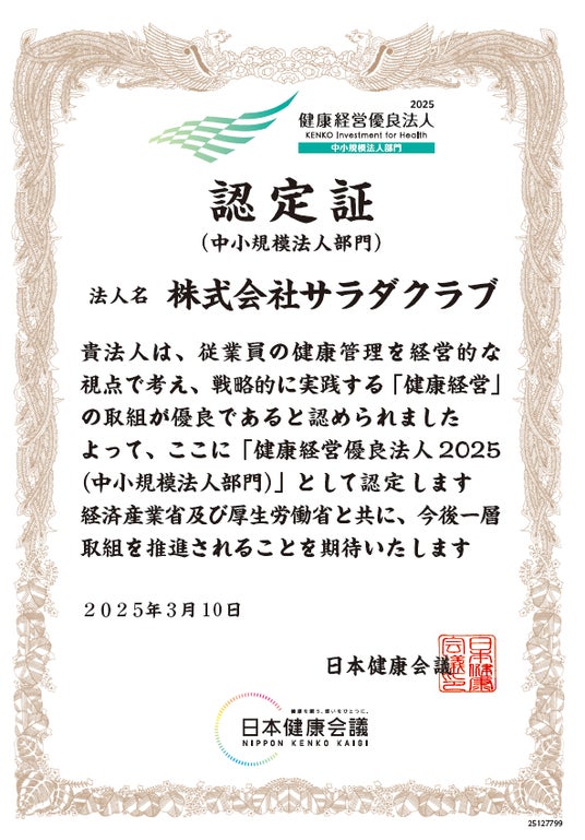 株式会社サラダクラブ(代表取締役社長:新谷昭人、本社:東京都調布市)は、日本健康会議が認定を行う健康経営優良法人認定制度において、「健康経営優良法人2025(中小規模法人部門)」に認定されました。昨年に続き、2年連続の認定となります。