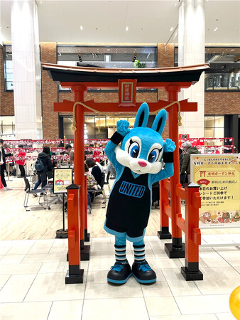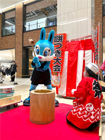 有明ガーデンのお正月イベントにTUBCのマスコットキャラクター「ユナイト」が登場し、餅つきやフォトスポットでのグリーティングを実施。