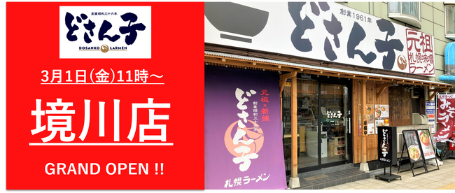 株式会社小僧寿しの子会社であるアスラポート株式会社どさん子事業本部は、大阪府大阪市西区境川にて『どさん子ラーメン境川店』を2024年3月1日(金)グランドオープン致しました。