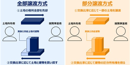 一方、「部分譲渡方式」では、土地所有者が土地の権利を所有したまま、開発事業者が区分所有建物を建設します。建物完成後、土地所有者は交換比率に応じて土地の持ち分を開発事業者に譲渡し、同時に区分所有建物の一部を開発事業者から譲渡してもらいます。