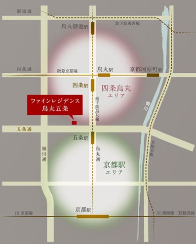 ■「ファインレジデンス烏丸五条」について 「ファインレジデンス烏丸五条」は、京都市営地下鉄烏丸線「五条」駅から徒歩3分の場所に建築され、商業・行政・文化の中心として栄え、観光名所や伝統的な店舗も多く存在する「田の字」※1エリアに位置しています。
