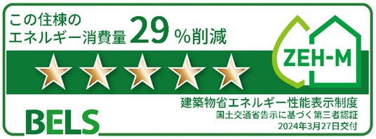 建物の外皮断熱性能の向上と高効率の省エネ設備・システムを導入することにより、共用部を含むマンション全体で一次エネルギー消費量を20%以上削減。BELSの最高ランク5を取得し、ZEH-M Orientedの認定および低炭素建築物※3に認定されています。