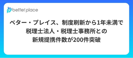 「福祉はぐくみ企業年金基金」(以下、「はぐくみ企業年金」)を中心に、企業年金・退職金制度の導入・設計をサポートする株式会社ベター・プレイス(本社:東京都新宿区、代表取締役社長:森本 新士、https://bpcom.jp/、以下、ベター・プレイス)は、税理士法人・税理士事務所との提携件数が、昨年11月の紹介パートナー制度刷新以降の新規提携件数として200件を突破したことをお知らせいたします。