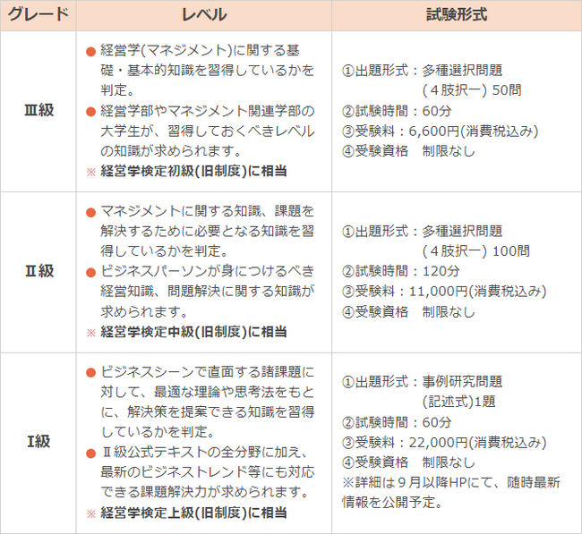 マネジメントに関する基礎・専門的知識、経営課題解決能力が一定水準に達していることを全国レベルで資格認定する検定試験です。マネジメント検定(旧 経営学検定)は2023年4月より試験制度が改訂され、試験級が「III級」「II級」「I級」となりました。(最上位の「マスター」は2024年以降に新設予定です)