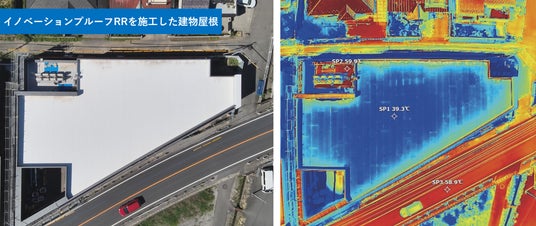 イノベーションプルーフRRを施工した建物屋根。周辺道路と比較し約20℃の温度低減を確認。