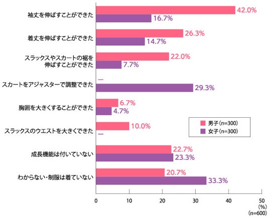 成長機能については、「袖丈を伸ばすことができた」、「着丈を伸ばすことができた」、「スラックスやスカートの裾を伸ばすことができた」などがあり、男子は「袖丈を伸ばすことができた」(42.0%)、女子は「スカートをアジャスターで調整できた」(29.3%)が、中学校制服に付いていた成長機能として最も多いです。