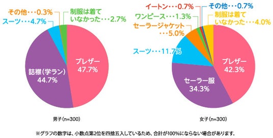 今回、高校1年生の子どもを持つ保護者600人を対象にした調査では、お子様が中学生のときに着用していた制服(冬服)のタイプは、男子は「ブレザー」(47.7%)、「詰襟(学ラン)」(44.7%)、女子は「ブレザー」(42.3%)、「セーラー服」(34.3%)が多く、中学校の制服は男女共にブレザータイプが詰襟・セーラー服より多くなっています。